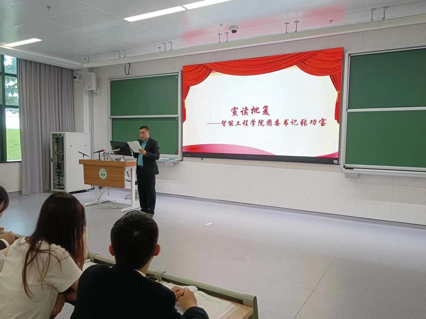 主持人宣读通过大会议程,并介绍与会嘉宾。学院团委书记张功宝老师宣读学院党委批复。