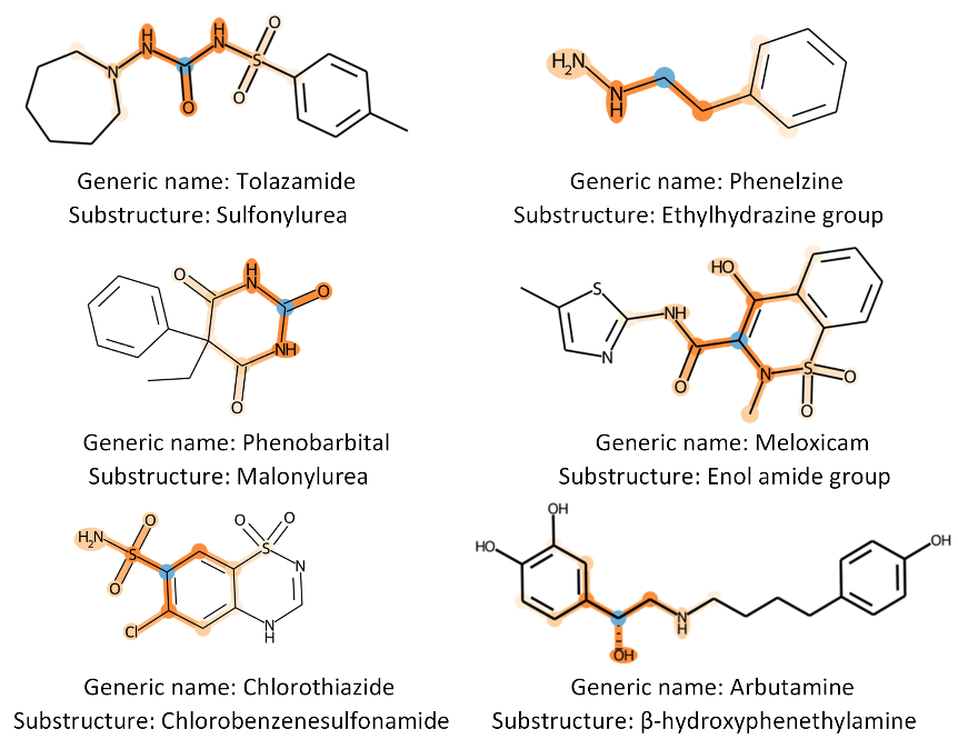 为了验证模型在判别式预测中的可解释性,该工作通过从药物化学的角度研究这些药物子结构的组合如何导致潜在的DDI,来证明DSIL-DDI的可解释性。根据注意力权重索引药物对中贡献最大的子结构对(子结构相互作用)。然后将这些子结构相互作用与现有文献进行比较。如图2所示,展示了3个DDI事件并可视化了它们的子结构对。