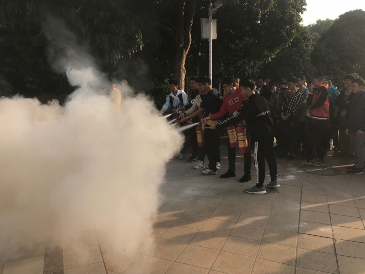 15:30-16:30,保卫处陈焕标老师现场为师生们讲解泡沫灭火器和干粉灭火器的使用方法、使用范围及注意事项。另外,陈老师还为大家详细介绍了消防水枪、消防水带及防毒面具的使用方法,边讲解边演示。随后,请现场的每一名同学亲自操作灭火器的使用。