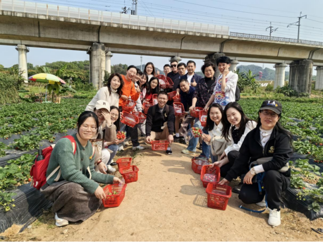 大家首先抵达了草莓采摘基地,开始采摘活动。在这片色彩斑斓的果园中,一颗颗鲜红的草莓在阳光下闪耀,诱人的果香令人垂涎欲滴。草莓的香甜与田园的宁静相得益彰,老师们在忙碌的工作之余,享受着这一时刻的宁静与满足。