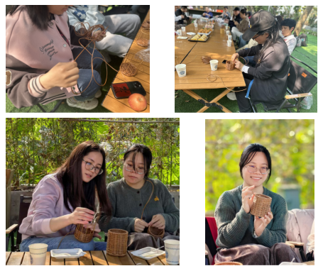 随后,大家在户外营地参与了手工编织活动。藤条在她们的巧手中穿梭,编织出一个个细致精美的工艺品。微风拂过,阳光洒在她们的身上,仿佛为她们的创作增添了一份灵感与活力。