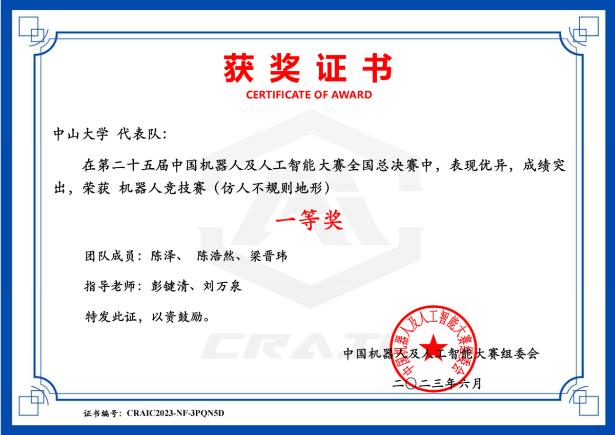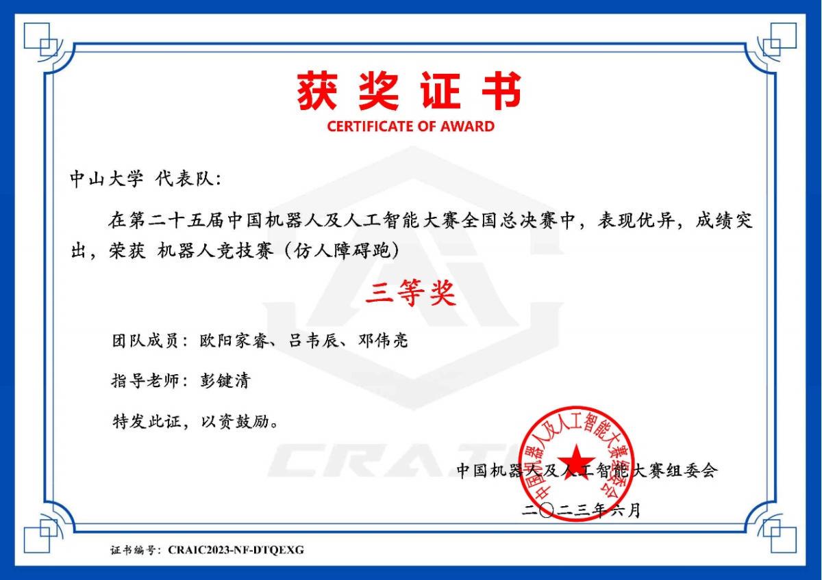 近日,第二十五届中国机器人及人工智能大赛落下帷幕,由刘万泉院长和彭键清老师指导的21级智能科学与技术专业本科生陈泽、陈浩然、梁晋玮团队在竞技赛(仿人不规则地面)项目中荣获全国总决赛一等奖,21级智能科学与技术专业本科生欧阳家睿、邓伟亮、吕韦辰团队在竞技赛(仿人障碍跑)项目中荣获全国总决赛三等奖,21级智能科学与技术专业本科生廖宇轩、胡深裕、刘书睿团队在百度Apollo星火自动驾驶大赛-城市道路赛项中荣获全国总决赛三等奖。