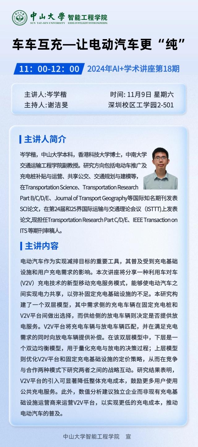 2024年11月9日上午11:00点,我院举办“车车互充-让电动汽车更“纯””主题学术讲座,讲座在深圳校区工学园2栋501举行。