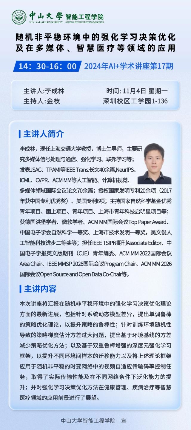 2024年11月4日下午14:30点,我院举办“随机非平稳环境中的强化学习决策优化及在多媒体、智慧医疗等领域的应用”主题学术讲座,讲座在深圳校区工学园1栋136举行。