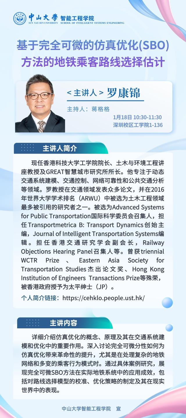 2024年1月18日上午10点半,我院举办“基于完全可微的仿真优化(SBO)方法的地铁乘客路线选择估计”主题学术讲座,讲座在深圳校区工学园1栋136举行。
