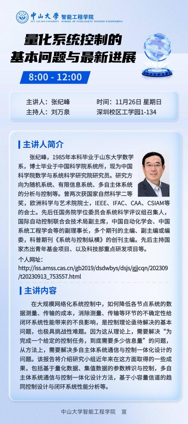 2023年11月26日上午8点,我院举办“量化系统控制的基本问题与最新进展”主题学术讲座,讲座在深圳校区工学园1栋134举行。