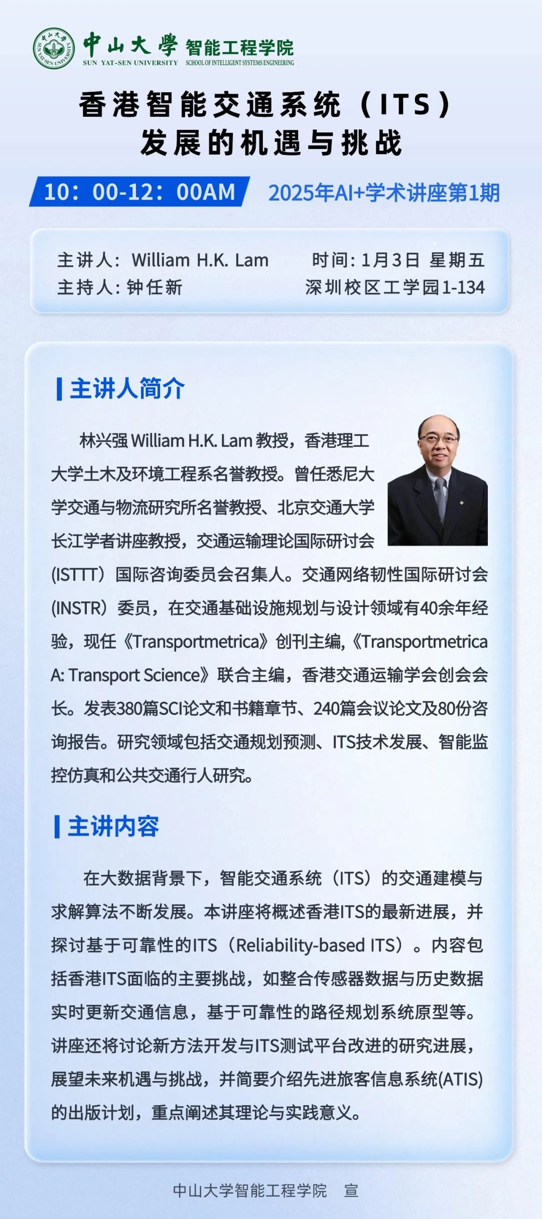 学术讲座 | William H.K. Lam:"香港智能交通系统(ITS)发展的机遇与挑战”的学术报告讲座