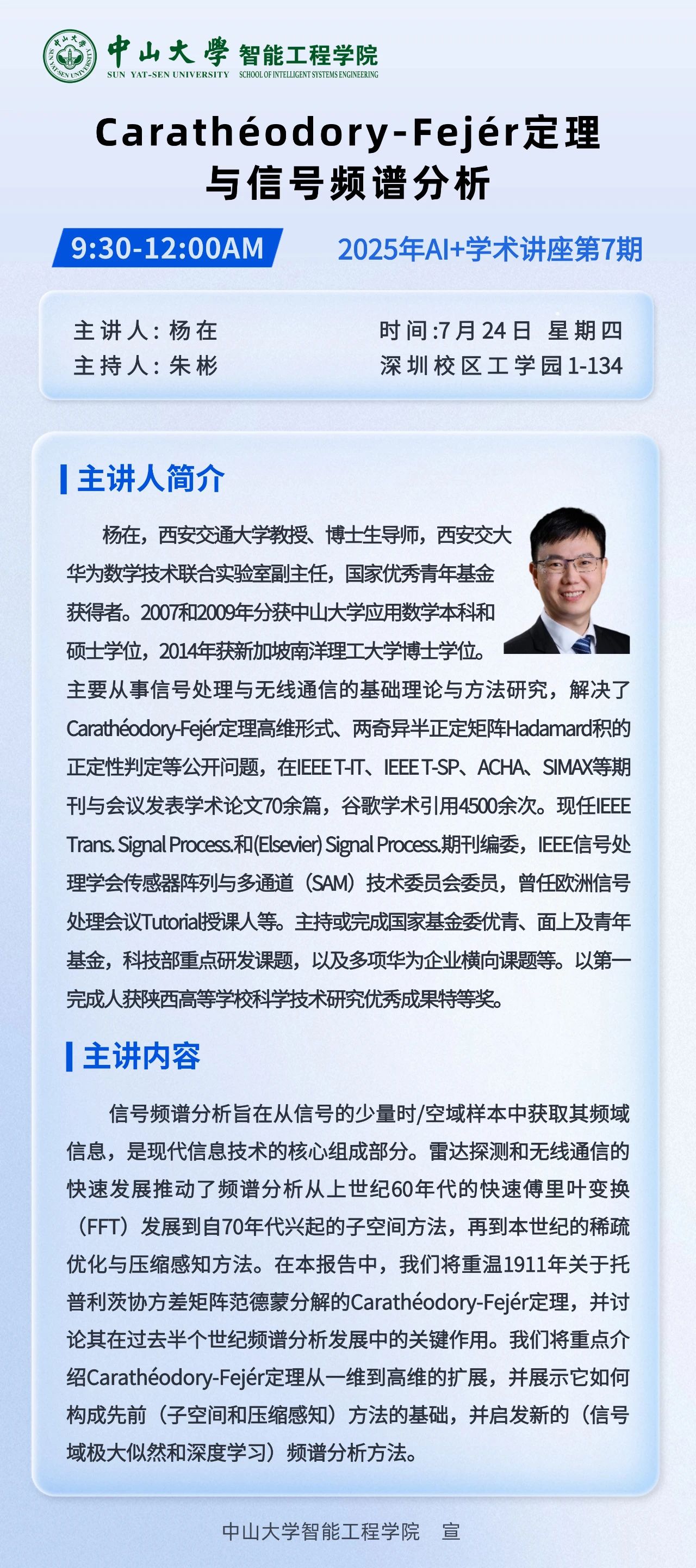 2025年7月24日上午09点30分,我院举办“Carathéodory-Fejér定理与信号频谱分析”主题学术讲座,讲座在深圳校区工学园1栋134举行。